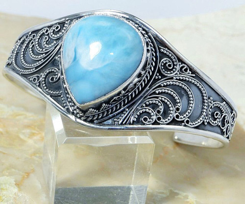 Широкий браслет чернёного серебра с крупным ларимаром. На руке сидит очень плотно, т.к. бабушка Эрики была очень худощава.